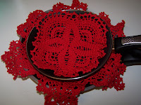 J'ai fait ce napperon en coton nº6 ( aiguille nº 1,75 ) et en rouge foncé afin de protéger mes poêles quand elles sont rangées les unes sur les autres.