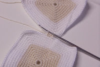 Monter 6 ml, fermer. Faire 12 ms dans le rond. Continuer ensuite avec : 2ms et 3 ms ds la ms suivante; 2ms, 3ms ds la ms suivante... On a alors 4 coins ( 3ms ) et 2 ms entre.. Continuer en faisant ds la 2ème ms des coins, 3ms. Faire deux carrés à l'identique, de la grandeur désirée et avec les couleurs choisies. Raccorder comme expliquer sur la photo, un coin sur le milieu de l'autre carré. Et crocheter tout le tour en ms. Enfiler de la ouate de rembourage dans une petite ouverture et terminer en ms. Passer un fil au milieu et y coudre un bouton fantaisie ou une fleur.